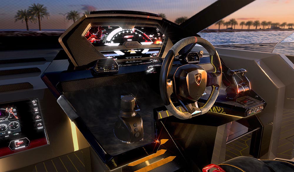 I valori comuni che caratterizzano il mondo dello yachting e quello delle supercar hanno dato vita a questa splendida collaborazione. Look iconico, prestazioni da capogiro e qualità in ogni dettaglio rendono onore allo stile tutto italiano della nave.Questo yacht a motore sportivo è costruito per la velocità. Le linee aerodinamiche ed il peso, distribuito uniformemente attraverso un design ultraleggero, ricordano in tutto e per tutto una classica super car Lamborghini.Grazie a due motori MAN V 12 da 2.000 CV ciascuno, sarà lo yacht più veloce della flotta Tecnomar. Il suo design incorpora uno scafo super performante appositamente studiato, sviluppato utilizzando la fluidodinamica. Ispirato ai modelli di roadster Lamborghini, il tetto rigido dello yacht contribuirà alle sue prestazioni aerodinamiche e proteggerà gli ospiti dalle intemperie. Le luci di prua sono un omaggio alla Lamborghini Sián FKP 37.Sono stati utilizzati materiali ad alte prestazioni in considerazione del peso e della funzionalità dello yacht. L’artigianato italiano condiziona tutti gli interni con elementi inconfondibili del mondo automobilistico, come forme esagonali, linee pulite e colorazioni audaci.La cabina di pilotaggio in stile automobilistico è una caratteristica straordinaria dello yacht. Qui, tutti i sistemi di navigazione e monitoraggio sono completamente integrati con dettagli realizzati in fibra di carbonio e pelle.