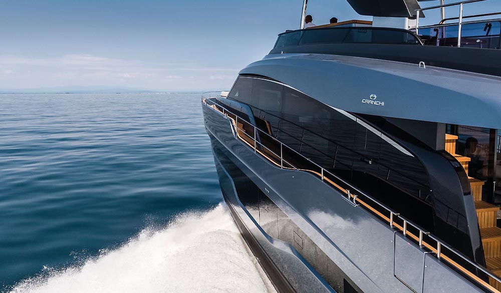 Anche grazie al suggestivo gioco di cromatismi tra struttura e sovrastruttura, con quest’ultima che risulta visivamente alleggerita, le linee del Settantotto si presentano filanti e sinuose e amplificano gli ambienti ampi e i volumi generosi degli interni, perfettamente illuminati dalla luce naturale come suggerito dalle simmetriche sottrazioni nello scafo a livello del main e del lower deck.Volumi ampi, eleganza e funzionalità sono la cifra distintiva anche del quadrato, dove sono distribuiti in modo ottimale cucina, salone e aree per il relax. Particolare non usuale per yacht di queste dimensioni è la presenza di un ulteriore bagno anche sul ponte principale. Sul main deck e sul fly, lo yacht offre grandi spazi all’aperto, con aree dedicate alla socialità e al relax sia a poppa che a prua.A queste si aggiunge anche la spiaggetta raggiungibile in modo sicuro e agevole. Dotata di un lift che le permette di alzarsi e abbassarsi e di traslare in avanti, la plancia può diventare un’immensa terrazza sul mare grazie alla straordinaria superficie concessa dal vano garage rivestito in teak. Aprendo il portellone del vano, si svela uno spazio ampio in cui la zona preposta all’alloggiamento di tender e moto d’acqua può essere separata dalla parte più vicina alla spiaggetta dove possono collocarsi le chaise longue.Il layout sottocoperta prevede fino a quattro cabine, tutte con bagno: tre matrimoniali di grandi dimensioni e una cabina con letti singoli. Tutti i letti sono posizionati in senso longitudinale rispetto all’asse poppa/prua per garantire il migliore comfort durante il riposo. Gli ambienti sono arredati con uno stile raffinato ed elegante. La cabina armatoriale a tutto baglio a centro barca con cabina armadio, angolo studio o beauty corner regala sensazioni da grande suite di lusso.Eleganza sofisticata e grande comfort contraddistinguono anche la cabina VIP a prua. Risulta comoda anche la cabina riservata all’equipaggio, con due cuccette e bagno con doccia separata. La cabina marinaio, con accesso distinto rispetto al resto degli ambienti, ospita anche la lavanderia con lavatrice ed asciugatrice.