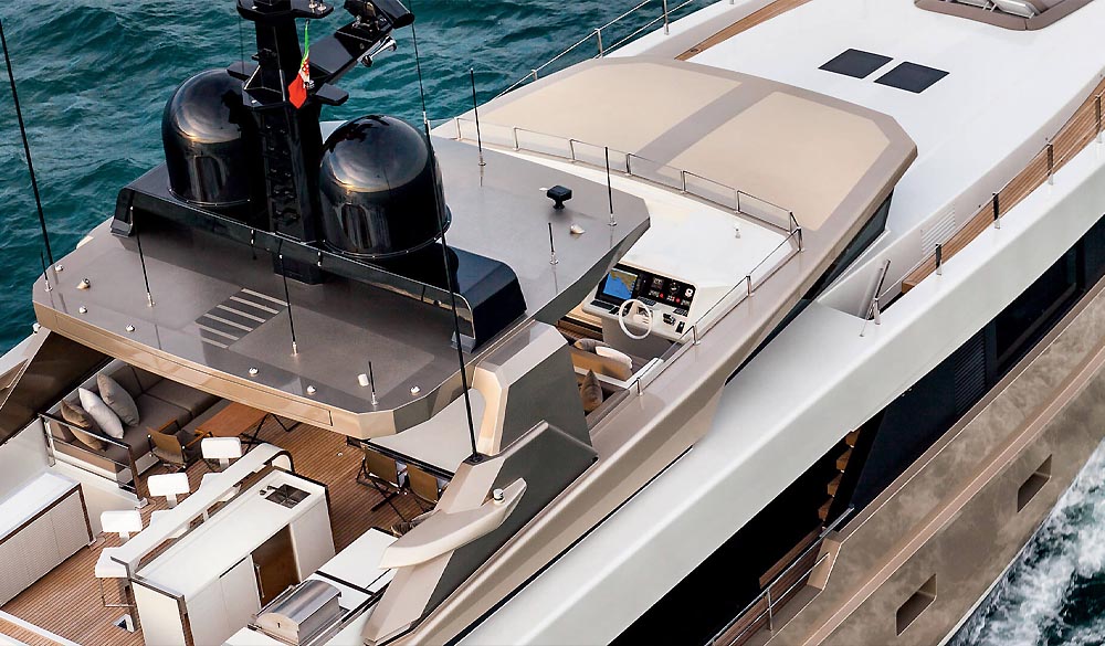 Costruita interamente in alluminio e caratterizzata da una linea molto moderna e innovativa, è perfetta per viaggiare, assicurando una velocità costante di 17 nodi e consumi eccellenti.La nave si presenta con un elegante scafo metallico color bronzo e una sovrastruttura bianco perla con aree nere opache in corrispondenza delle finestre del ponte principale e dei dettagli dell’hard top. Tutto lo yacht presenta ampie superfici vetrate che forniscono molta luce agli interni, i quali ricordano, per stile e colori, quelli di una moderna villa in stile minimale.Il pozzetto di poppa sul ponte principale è caratterizzato da ampi spazi, tutti dedicati al relax ed alla convivialità. Quest’area dà anche accesso al beach club di poppa dove il grande portellone del garage si trasforma in una bellissima terrazza sul mare. Questa zona comprende anche un angolo bar e thermarium.Il ponte sole è abbellito da un’enorme terrazza con vista sul mare, divisa in due diversi livelli. Quello a prua è dedicato alla ristorazione ed è inoltre dotato di angolo bar e area lounge, mentre a poppa è posizionata una grande vasca calda per un massimo di 8 persone, che occupa una parte sostanziale dell’area.Il ponte principale è distinto da spazi ampi e confortevoli, in particolare nell’area principale del salone. All’interno del salone principale si trova anche la sala da pranzo. In avanti sul ponte principale si trova la cabina armatoriale, che prende tutta la larghezza dello yacht e presenta grandi finestre laterali che liberano la luce naturale in tutto l’ambiente. La suite include un ampio bagno privato che è direttamente collegato con due armadi. Sul ponte inferiore trovano quattro grandi cabine ospiti, due delle quali sono VIP. Ogni cabina è dotata del proprio bagno e tutti gli scafi sono aperti.La nave è stata recentemente venduta grazie a Lon McCloskey di Fraser. Il prezzo di vendita si aggira sui 8,500,000 dollari.